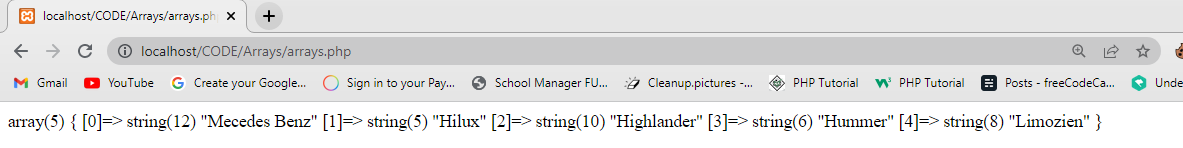 در مثال بالا، متغیر $cars شامل پنج مقدار رشتهای است. تابع var_dump() اطلاعات جامعی در مورد آرایه نمایش میدهد که شامل نوع هر عنصر، مقدار آن و همچنین تعداد عناصر می باشد. در آرایه ها برای نمایش یک عنصر خاص میتوان از اندیس آن استفاده کرد.