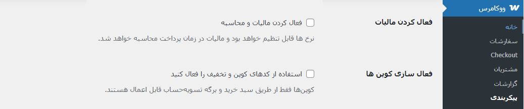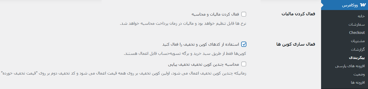 ما با گزینه دوم کاری نداریم چراکه به نفع فروشگاه شما نیست . پس همین گزینه اول را تیک زده و تنظیمات را ذخیره میکنیم . اگر اکنون دوباره به منو ووکامرس نگاه کنید ، متوجه خواهید شد که گزینه ” کوپن ” به زیرمنوهای ووکامرس اضافه شده است و اکنون میتوان کد تخفیف ایجاد کرد .
