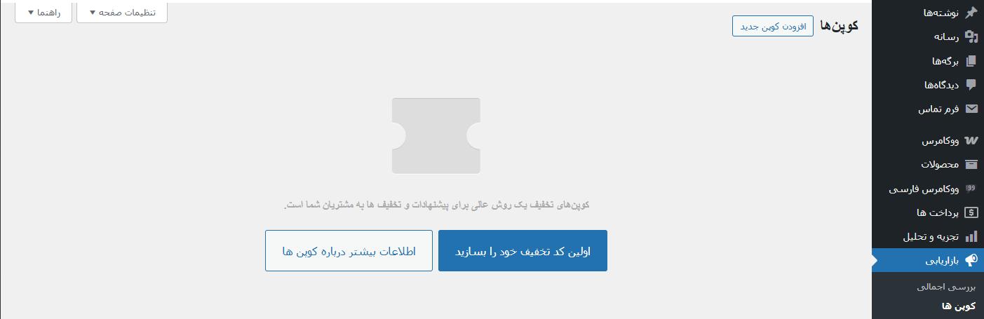 همانند تصویر بالا ، گزینه کوپن اکنون در اختیار شما است پس از این به بعد کارما ساده است و صرفا باید با گزینههای بخش کد تخفیف آشنا باشیم تا اطلاع داشته باشیم که باید چگونه کدهای تخفیف ایجاد کنیم .