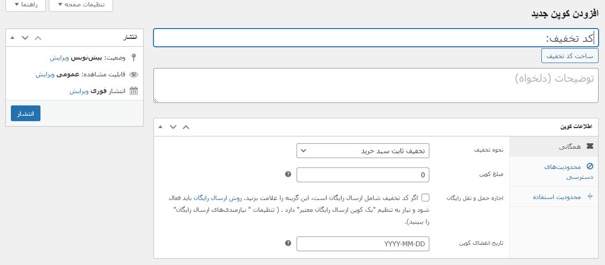 همانطور که مشاهده میکنید در این بخش 3 گزینه داریم بنامهای ” همگانی ، محدودیتهای دسترسی ، محدودیت استفاده ” که البته قبل از ورود به هر یک از این بخشها باید در ابتدای صفحه ، کد تخفیف را نامگذاری کنید . در بخش بالا و بجای کد تخفیف برای مثال متن زیر را وارد میکنیم :