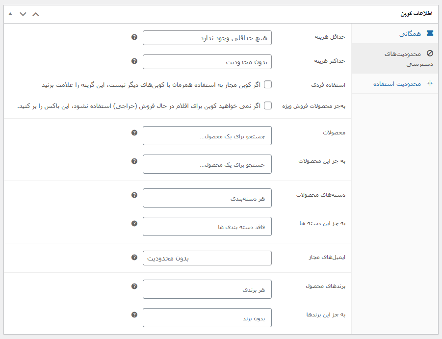 - ایمیلهای مجاز : اگر تصمیم دارید کد تخفیف برای کاربرانی که ایمیل آنها را مشخص میکنید اعمال شود