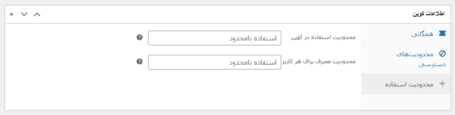 در این بخش شما امکان ایجاد محدودیت برای کوپن را دارید . در گزینه اول شما تنظیمات مهمی دارید . اگر بخش ” محدودیت استفاده در کوپن ” را مشاهده کنید شما باید با وارد کردن عدد ، این بخش را کنترل کنید . توصیه میکنیم هردو را روی عدد 1 تنظیم کنید چراکه اگر در گزینه اول ، عدد 1 را وارد نکنید ، این کد تخفیف تاجایی که سبد خرید صفر شود استفاده خواهد شد و یک گزینه خطرناک است .